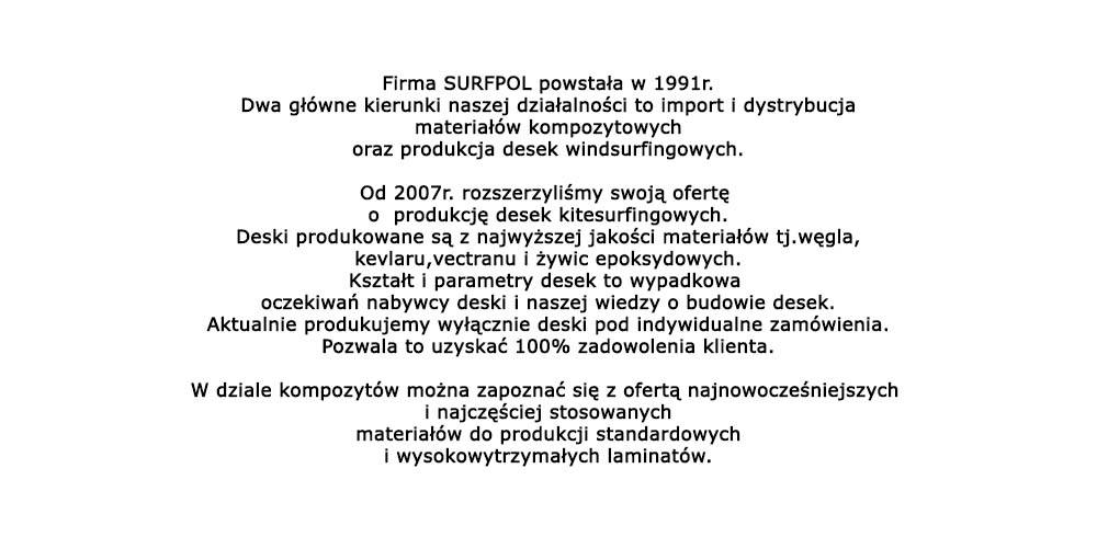 Firma SURFPOL powstała w 1991r. Dwa główne kierunki naszej działalności to import i dystrybucja materiałów kompozytowych oraz produkcja desek windsurfingowych.